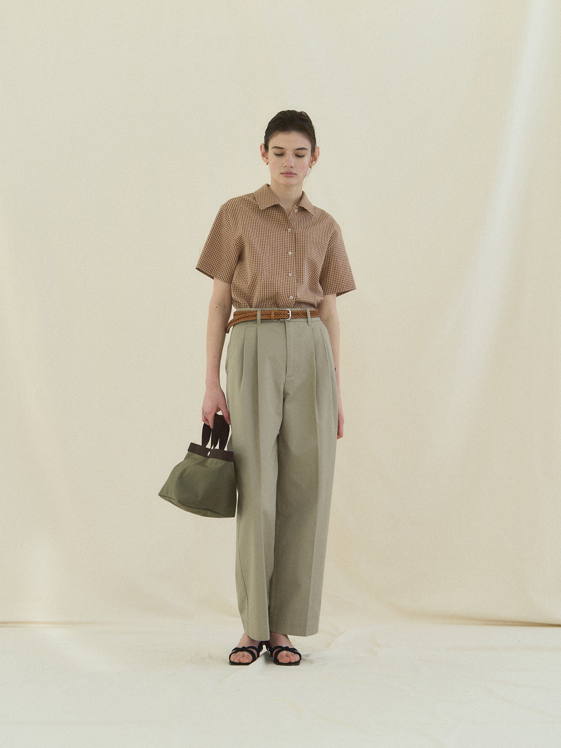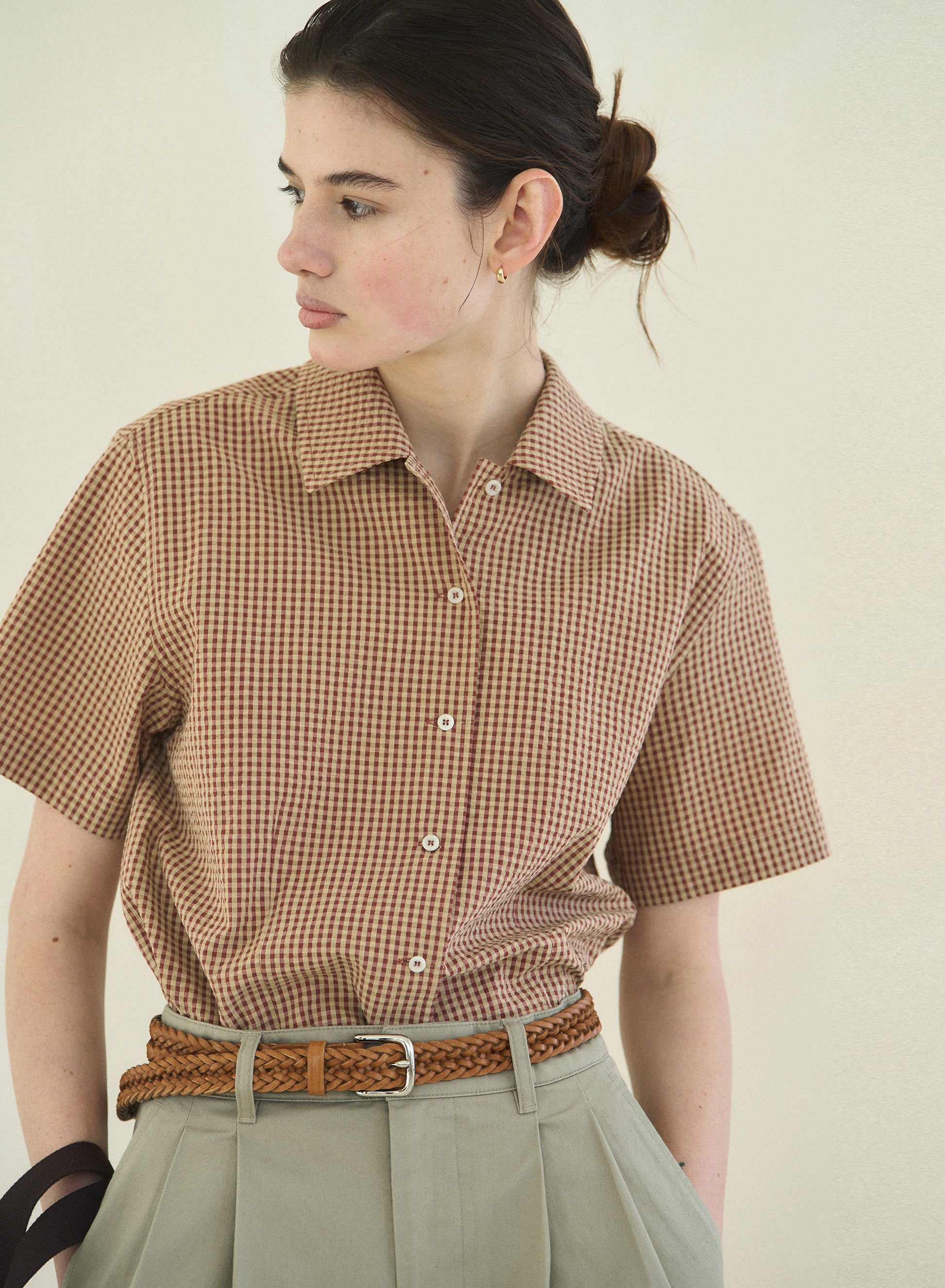 The refined gingham check pattern in soothing, natural colors creates a classic yet striking look, making this shirt a statement piece for your summer wardrobe. Brick Beige, reminiscent of warm summer sunlight, pairs perfectly with denim or light-colored pants for a standout look. Olive Navy, a unique blend of khaki and navy, can be effortlessly thrown over a silky skirt or white sleeveless top for a relaxed, elegant style.
