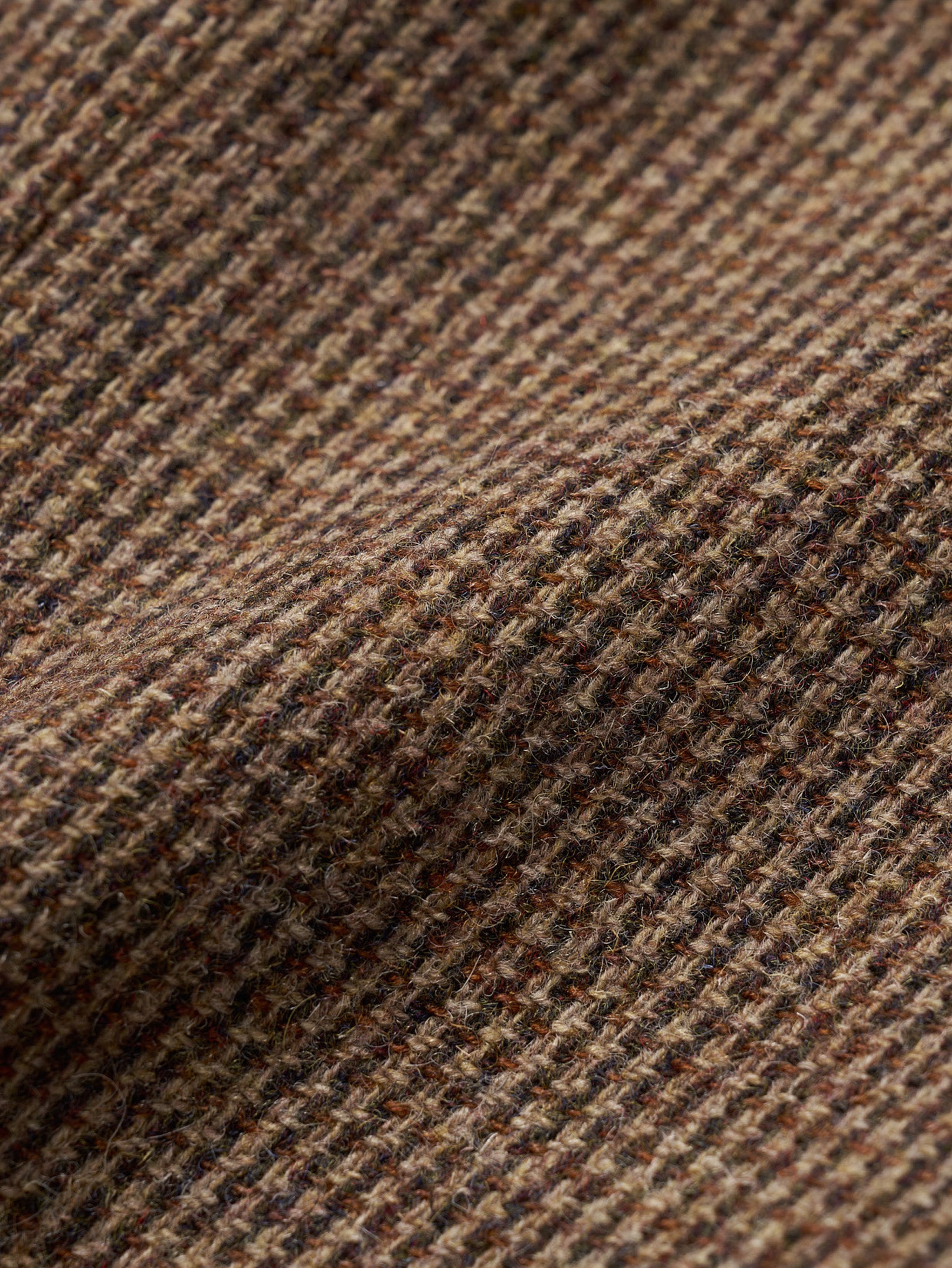 While the overall palette leans into warm browns, a closer look reveals a complex interweaving of orange brown, deep khaki, and beige threads that evoke the autumnal landscape of the Scottish Highlands. The blazer’s refined silhouette is defined by its structured yet subtle shoulder line, enhanced by a two button front and flap pockets that add to the clean, understated design. Emphasis is placed on the fabric and fit, with minimal decorative details to keep the focus on craftsmanship.