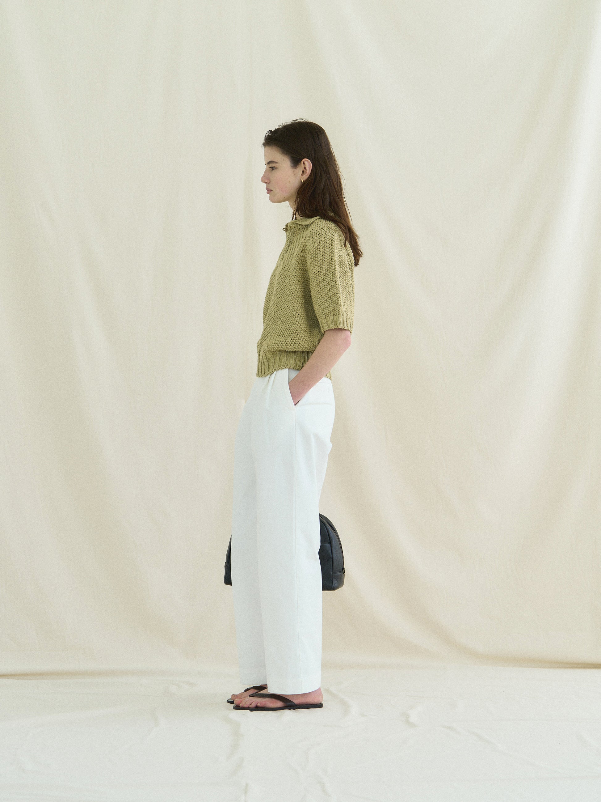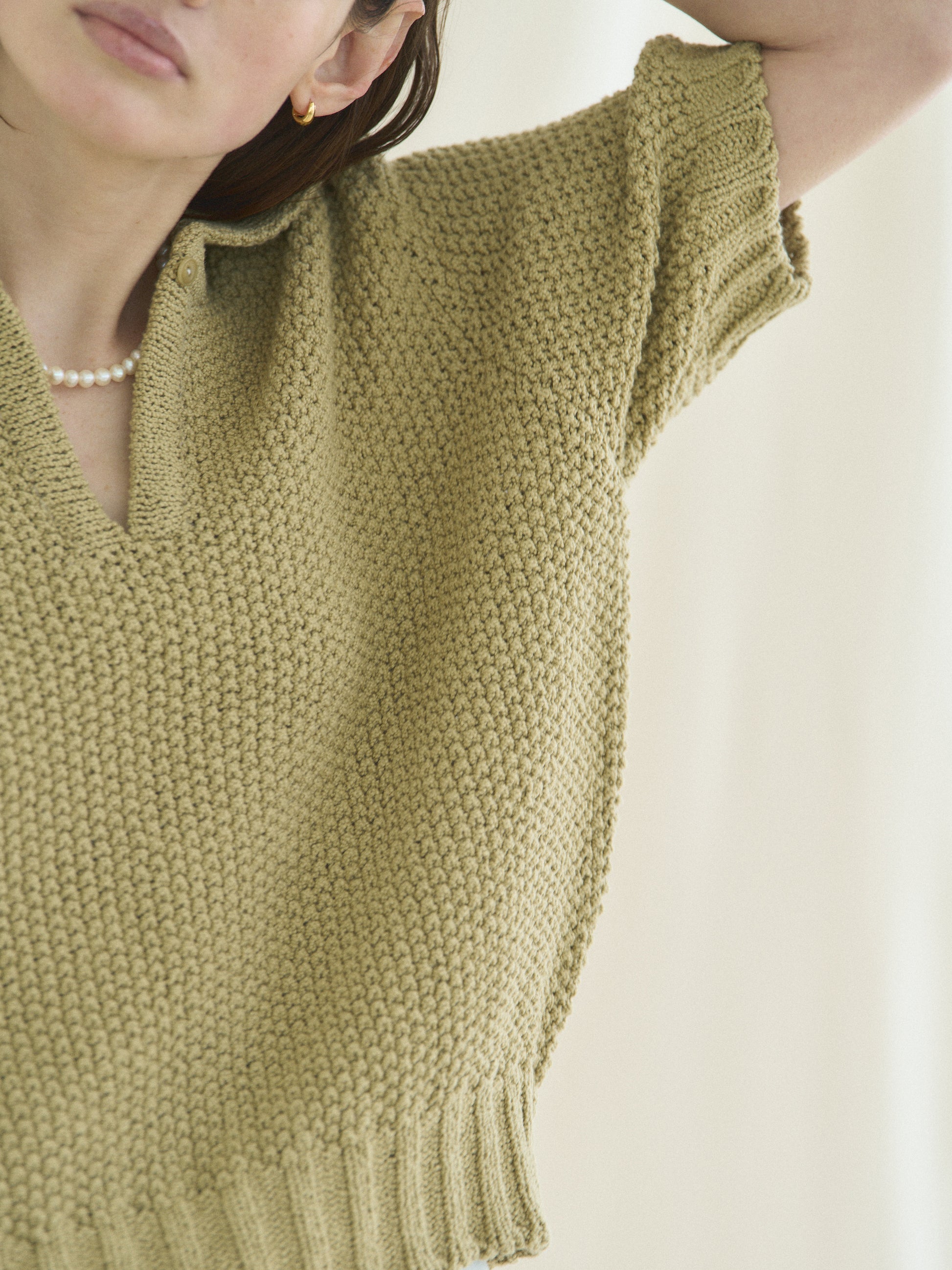 The slightly cropped length naturally tapers toward the hem, offering a stable fit and balanced proportions with a wide range of bottoms. A small button and loop detail at the neckline allows for versatile styling_ear it fastened for a polished polo look or leave it open for a relaxed V-neck feel.