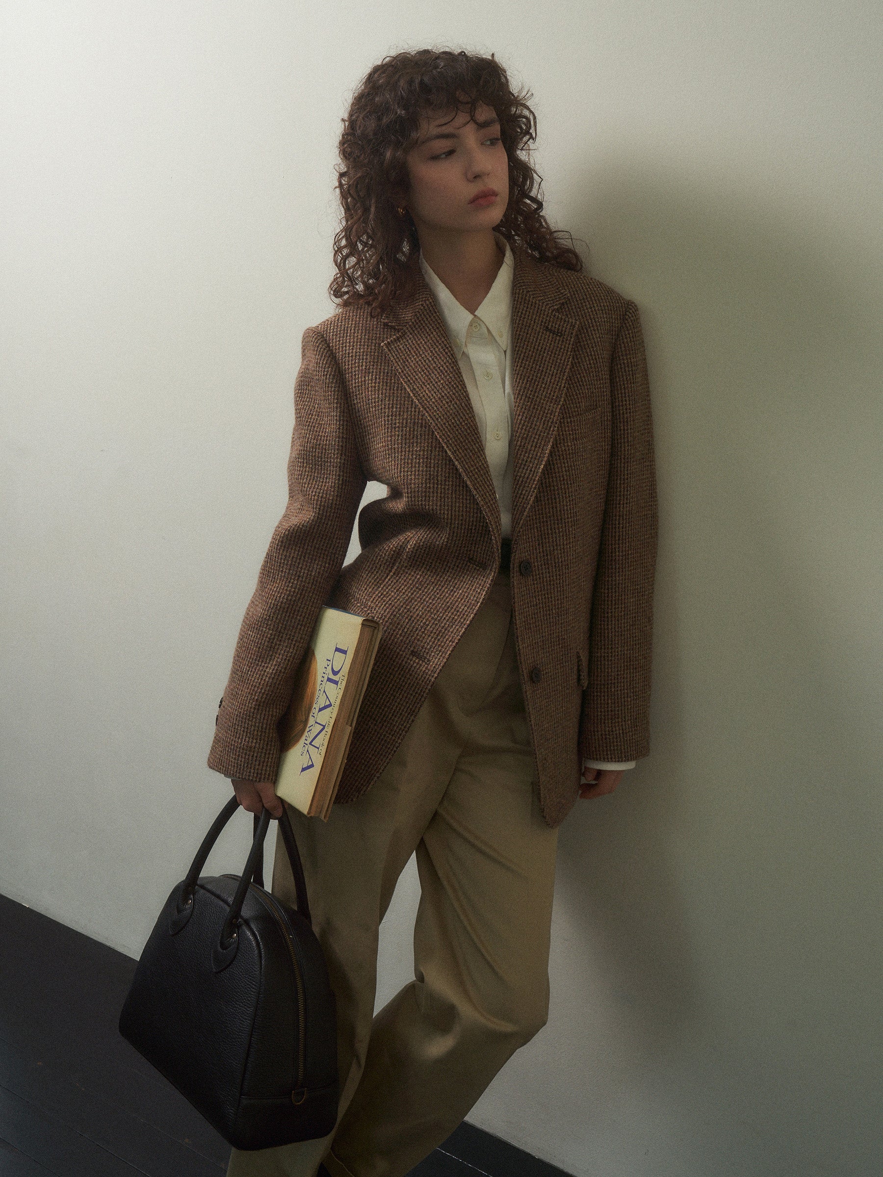 Crafted from Italian cow suede, the bag offers both durability and a velvety softness, with a rich brown tone that brings warmth and depth. The dark brown shrunken leather handles add a cozy character reminiscent of a well-loved teddy bear. An antique gold two-way YKK zipper enhances functionality, while the interior is lined with soft beige cotton canvas, lending a calm and refined mood.