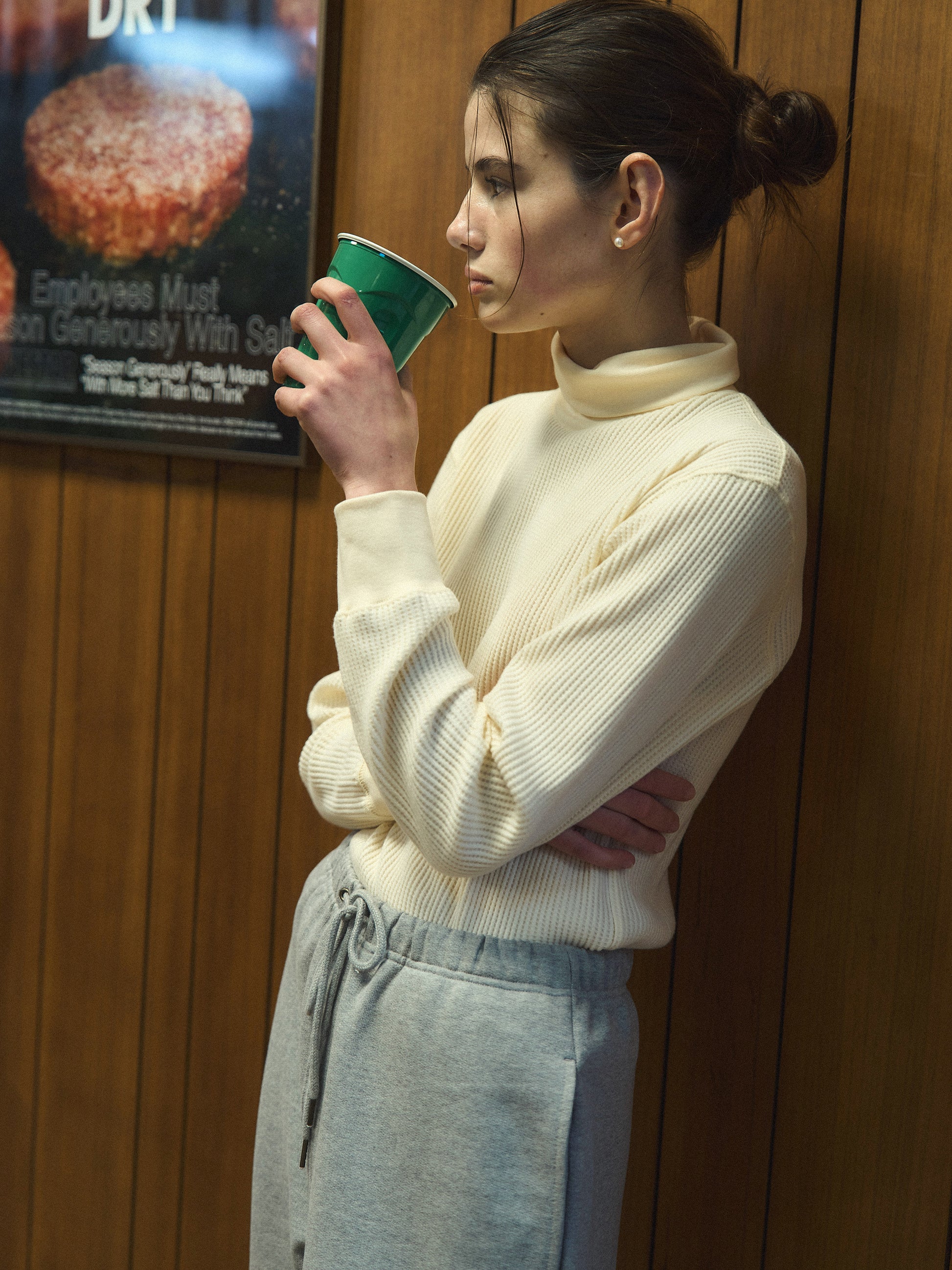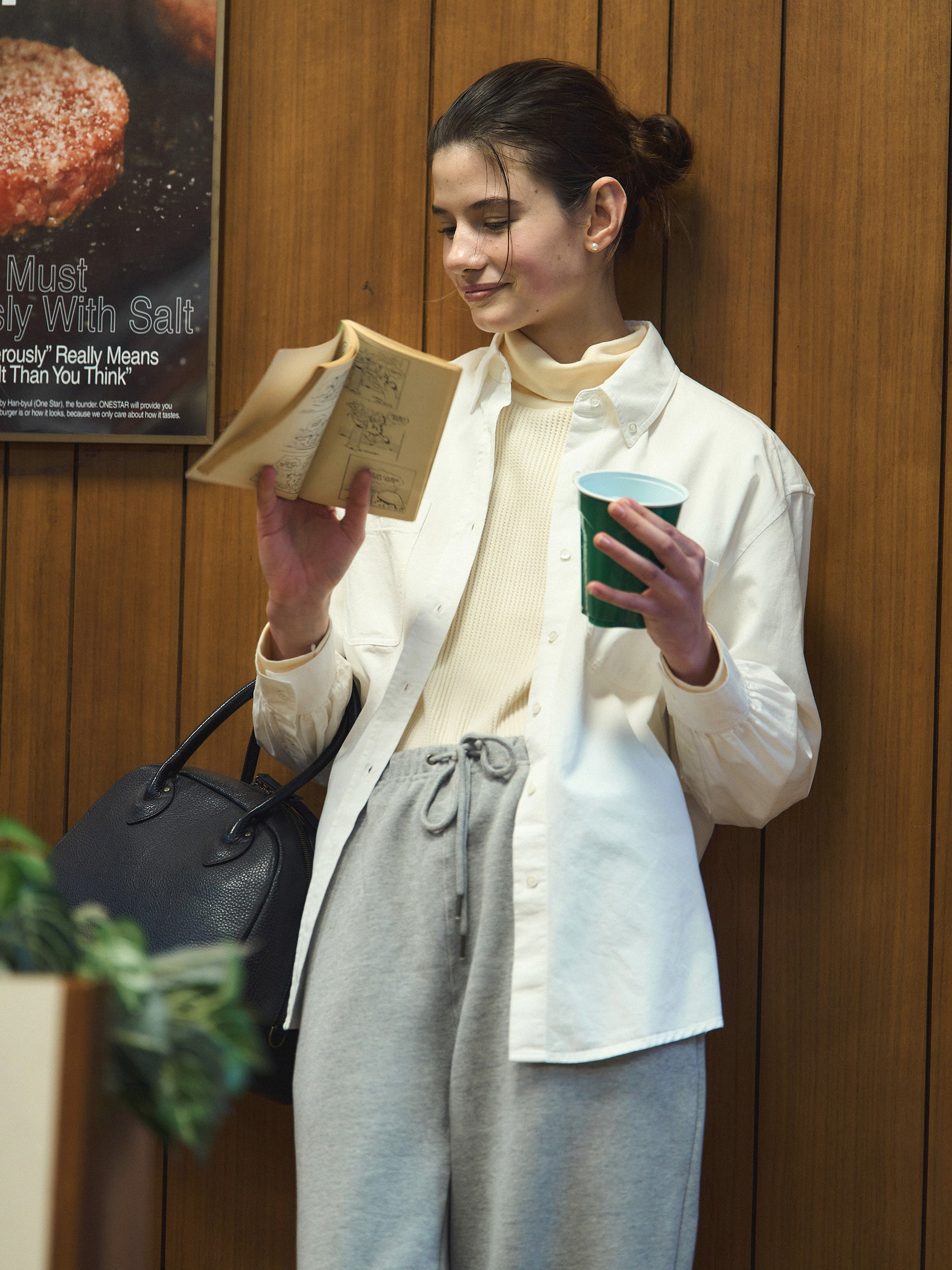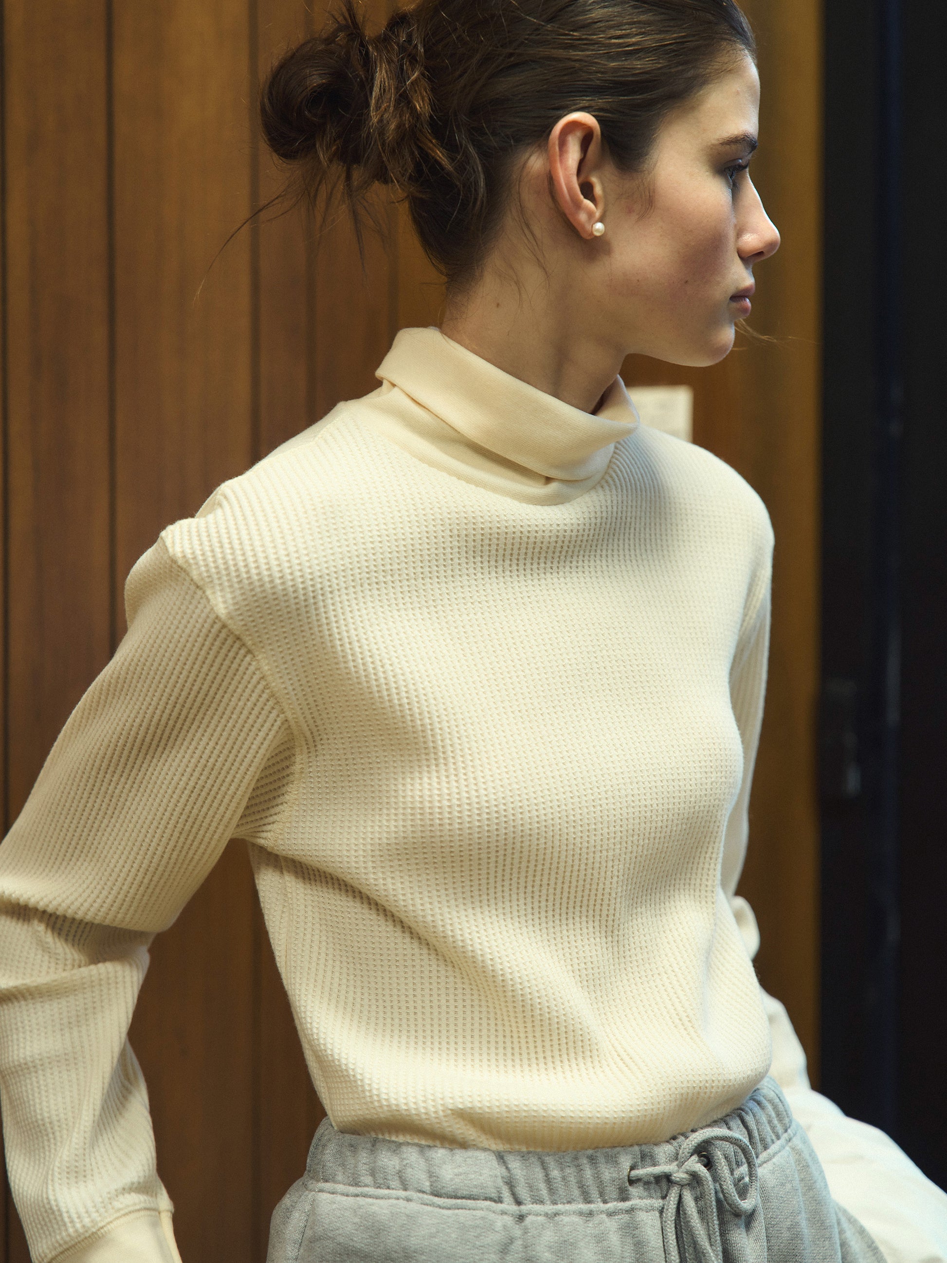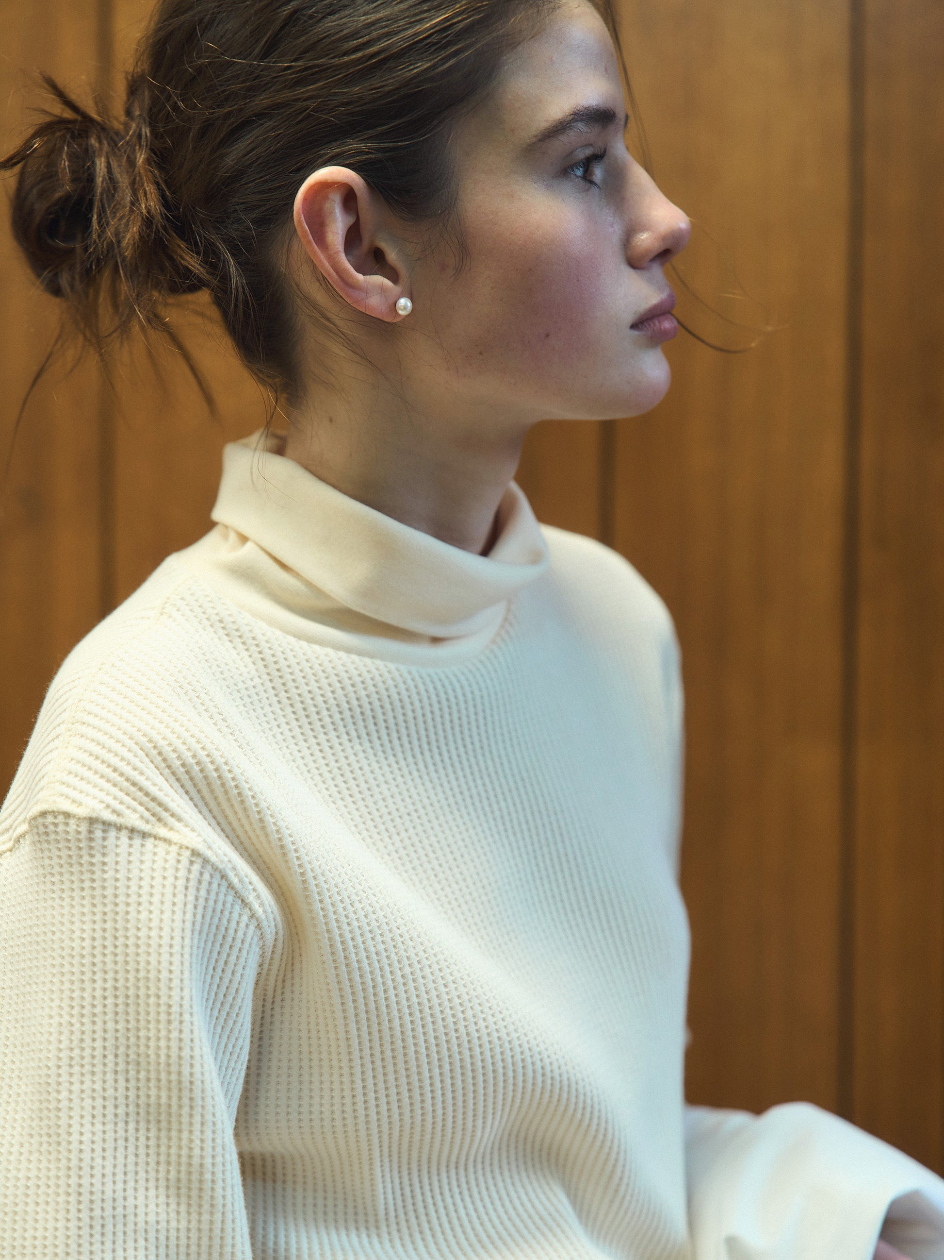 With a slightly longer length that covers the hips and an overlocked hem, it creates a clean and streamlined look without unnecessary bulk. Perfect for casual outfits, it can also be styled with a classic pearl necklace for an elegant, timeless vibe.
