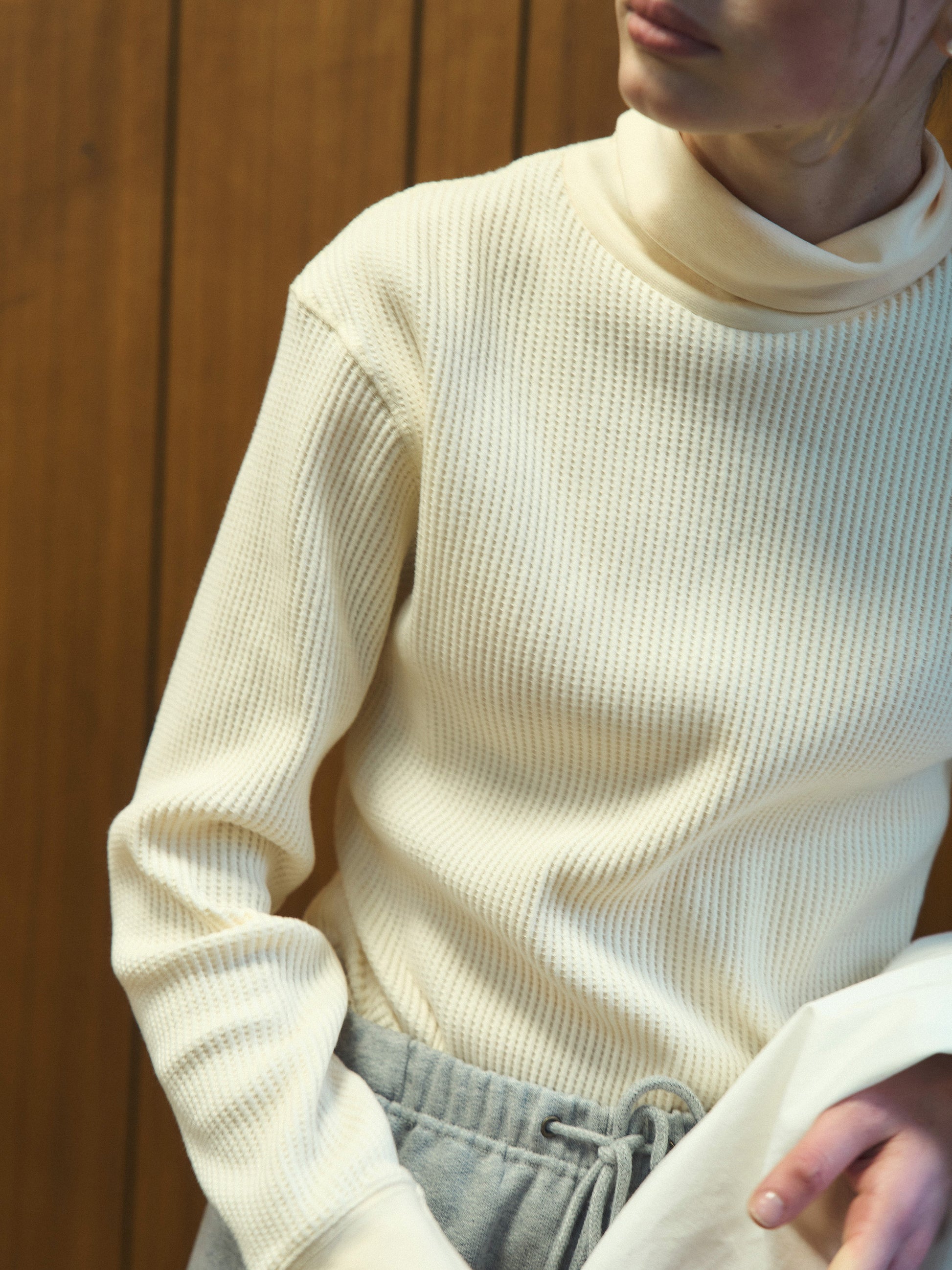The relaxed turtleneck can be folded down to create a soft, comfortable neck shape, and the well-proportioned length and non-restrictive fit ensure comfort throughout the day. Traditional thermal tees tend to cling to the body, but Outfitters' Waffle Turtle Tee features a drop shoulder and a looser silhouette, making it stylish enough to wear on its own.