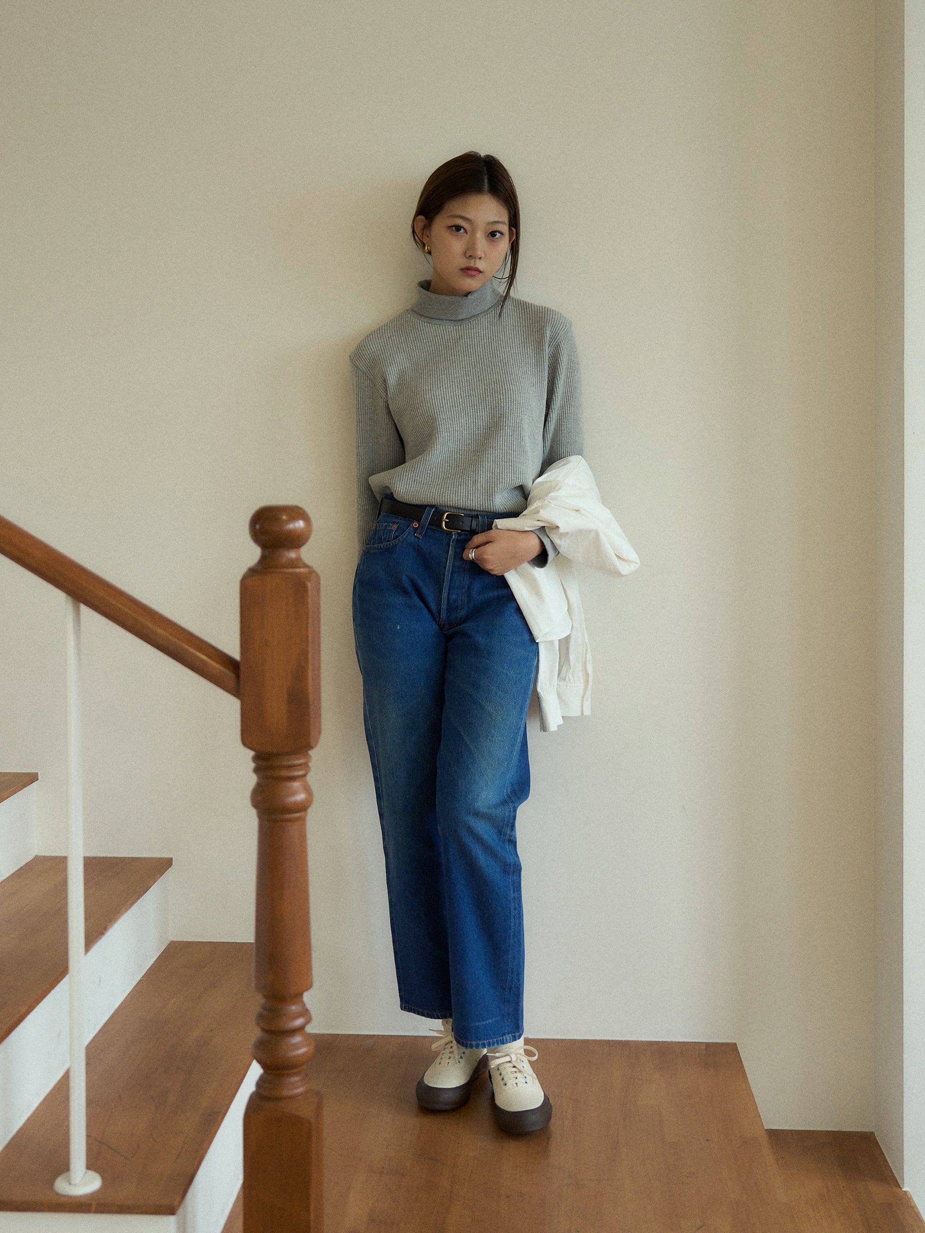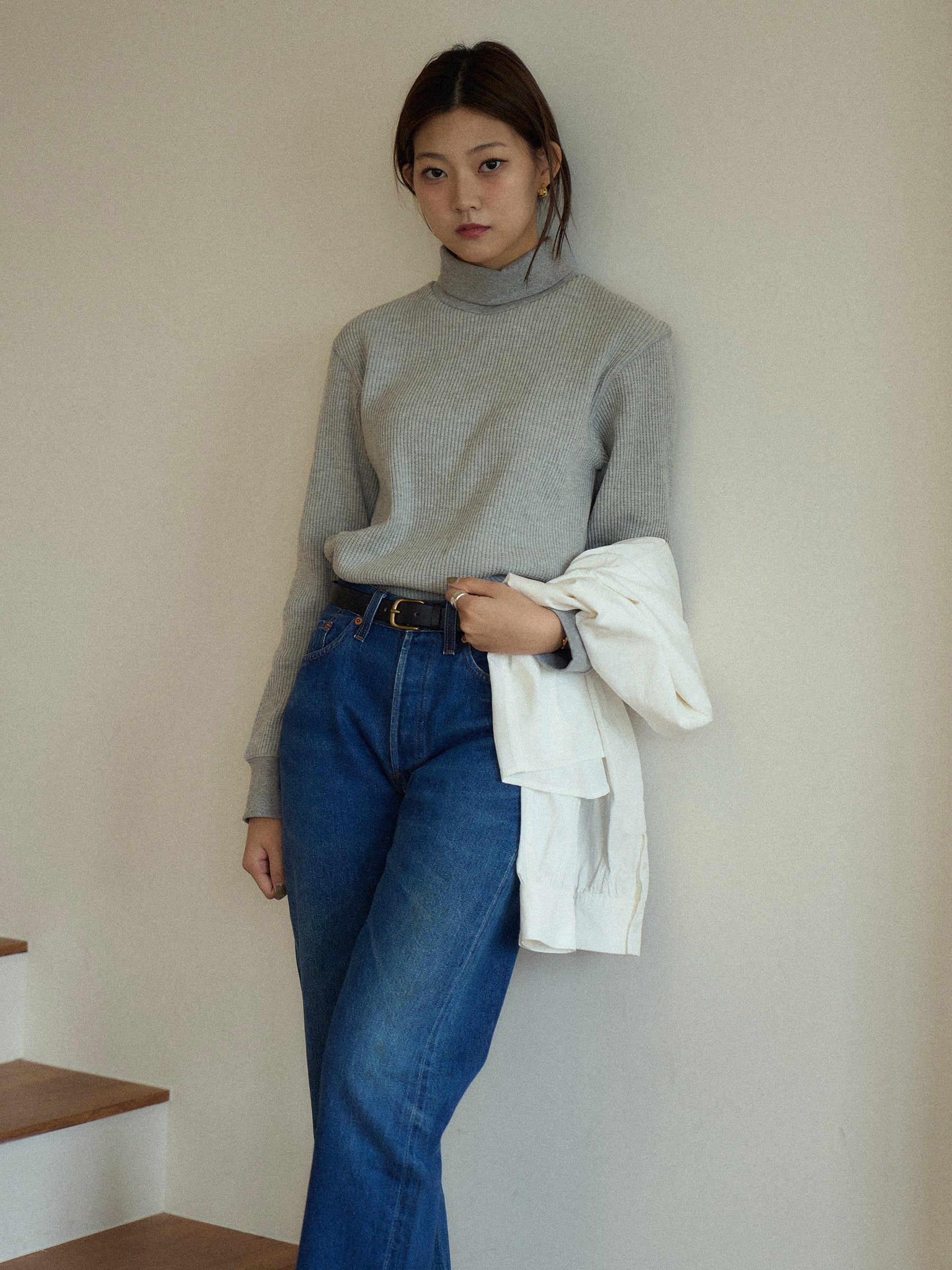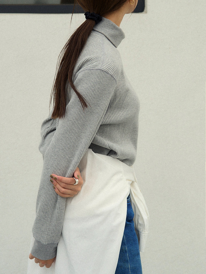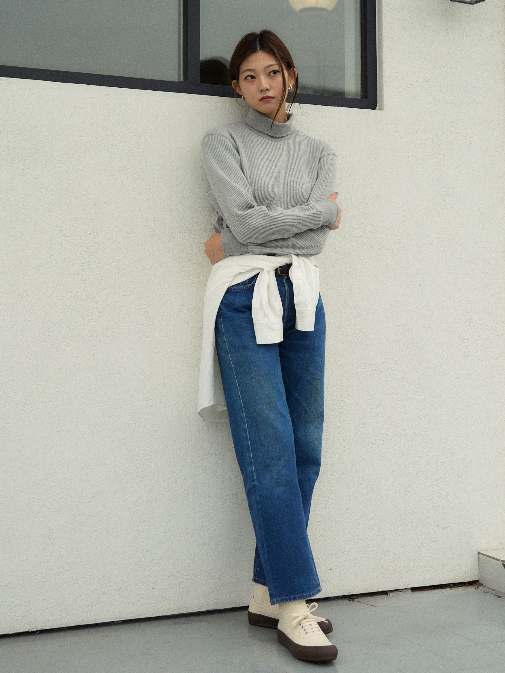 With a slightly longer length that covers the hips and an overlocked hem, it creates a clean and streamlined look without unnecessary bulk. Perfect for casual outfits, it can also be styled with a classic pearl necklace for an elegant, timeless vibe.