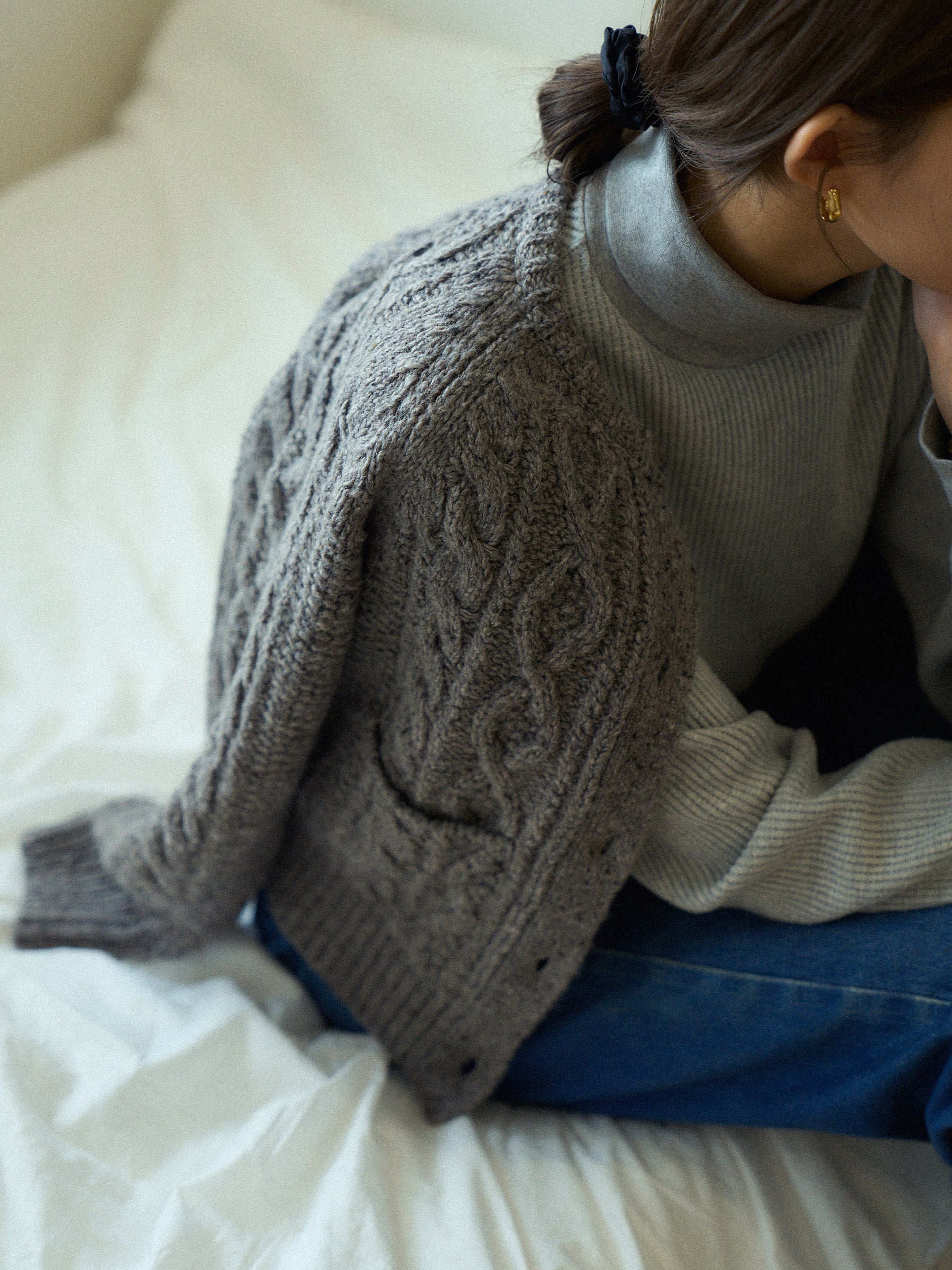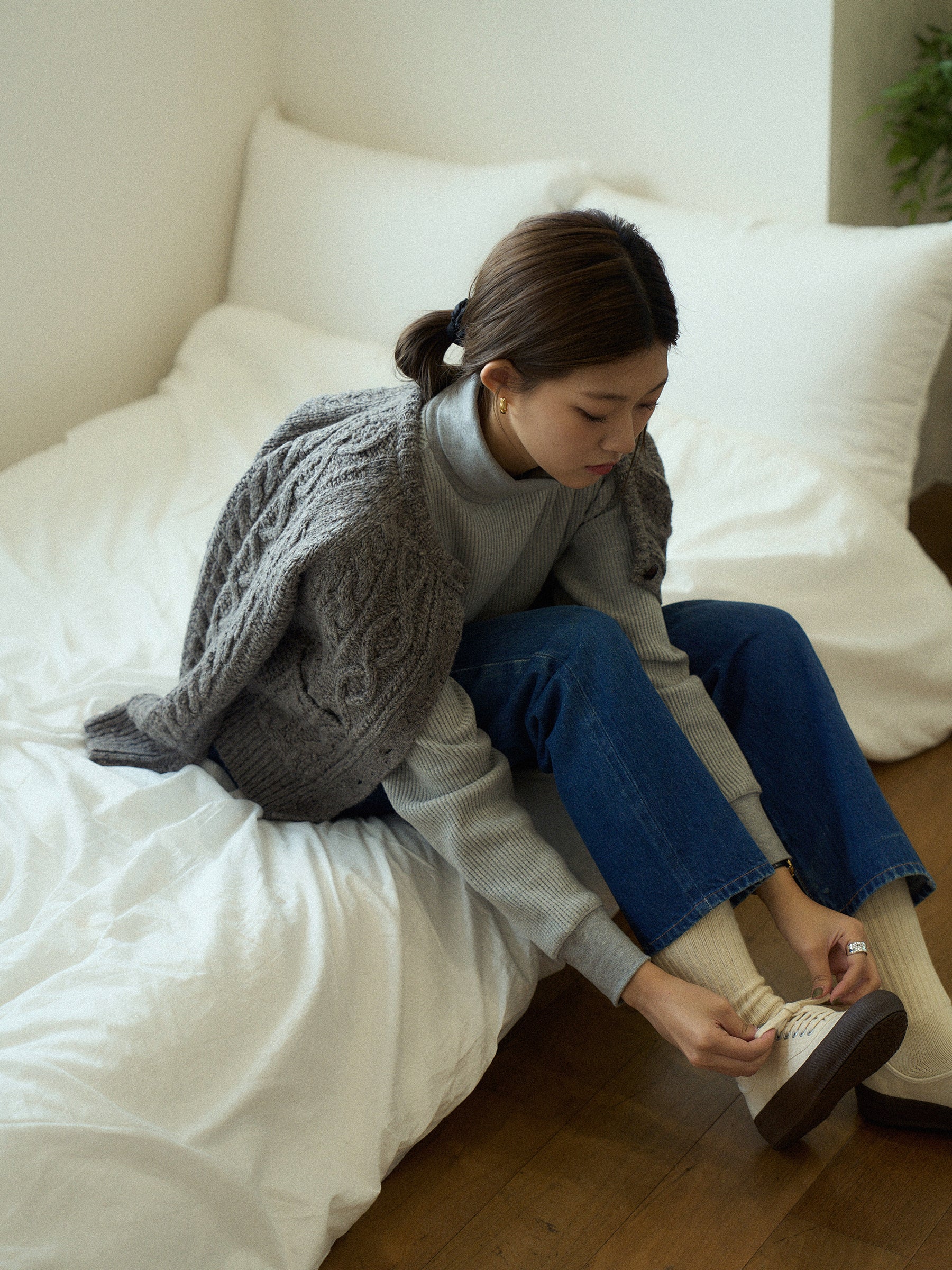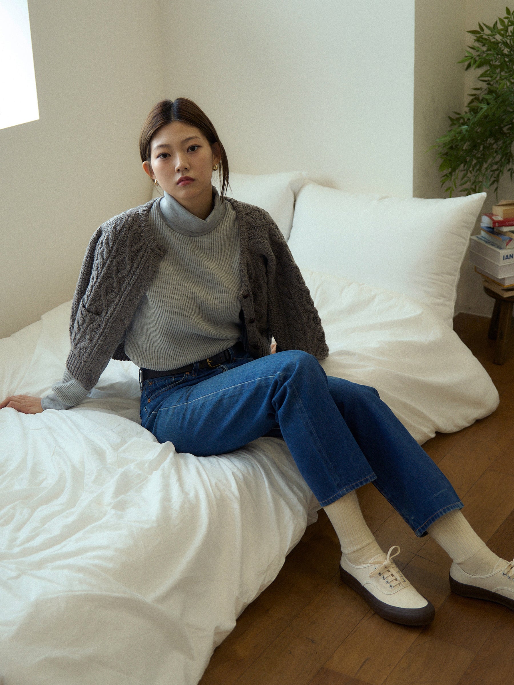 With a slightly longer length that covers the hips and an overlocked hem, it creates a clean and streamlined look without unnecessary bulk. Perfect for casual outfits, it can also be styled with a classic pearl necklace for an elegant, timeless vibe.