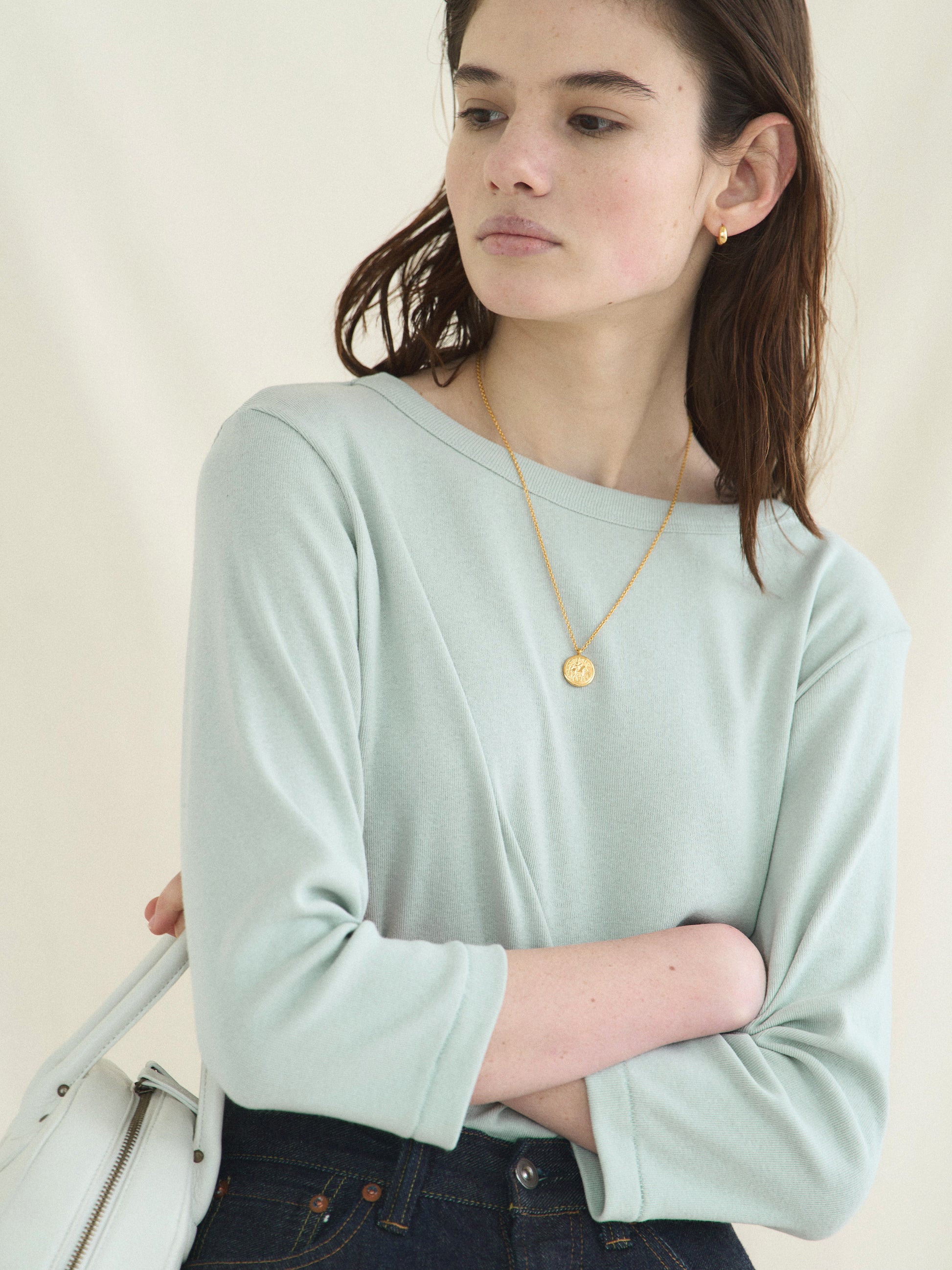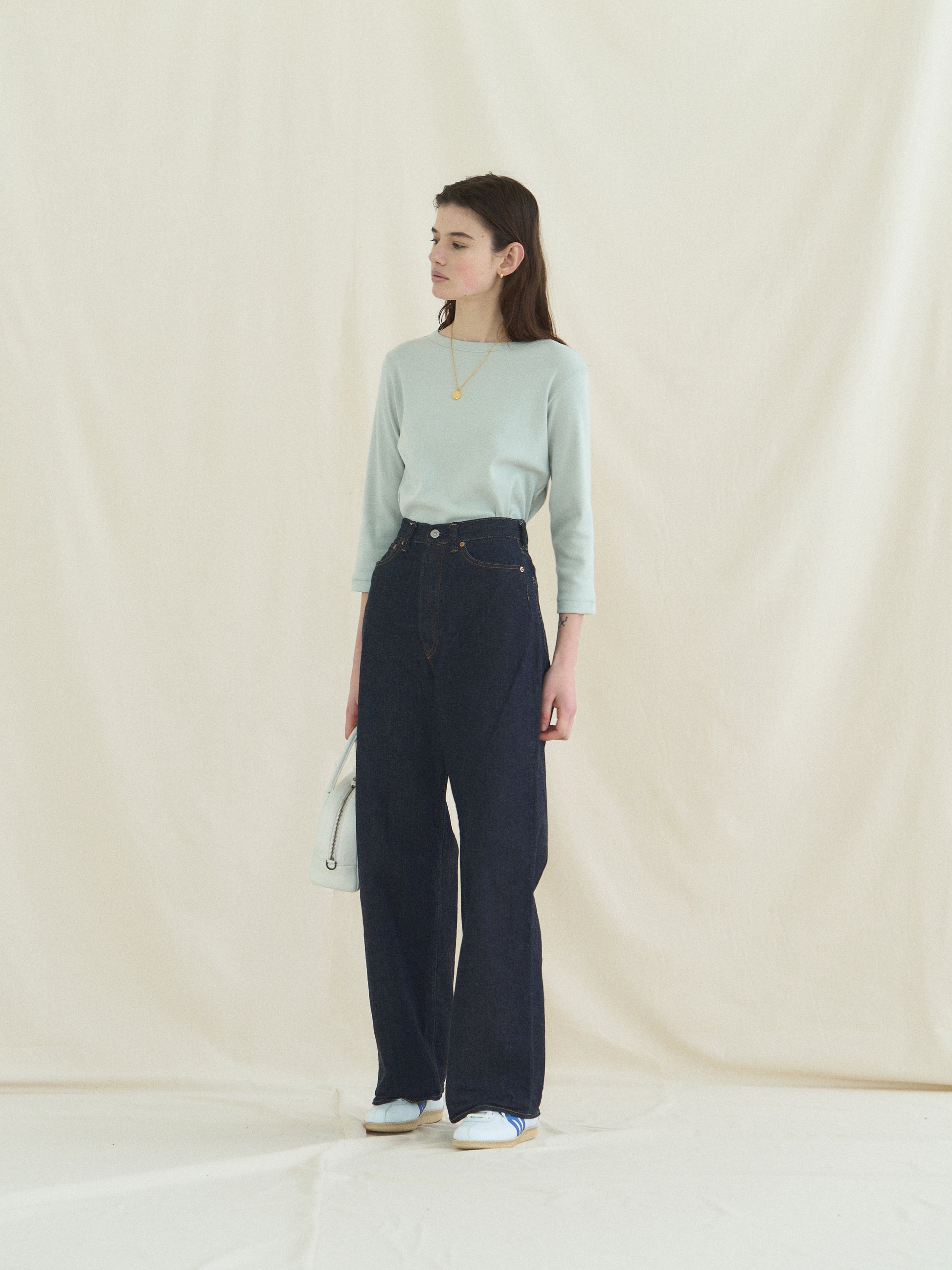 The graceful boat neckline sits close to the body, adding a classic and refined air, while the three-quarter sleeves give it a polished and effortless look. Although the overall silhouette is relaxed, the slightly tapered sleeves create a subtle slimming effect when worn. The sleeve ends and hem are finished with vertical cover stitching, reminiscent of vintage tees, adding both durability and a charming retro detail.